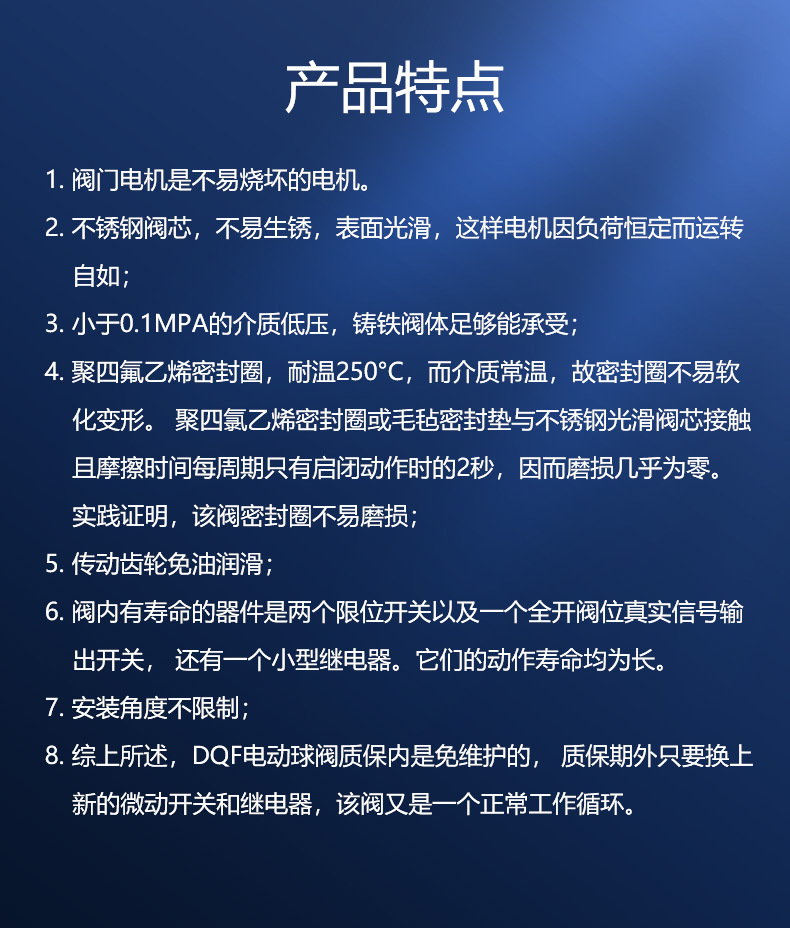 DQF电动球阀在无外来开启信号(继电信号)的情况下,在工作电源的作用下,保持全闭电锁定,此时指示盘处于全闭指示位置,电指示开关信号(继电信号)无输出。当加入开启信号后,内部小型继电器动作,主电机立即旋转,其传动轴上小齿轮同步旋转,带动大齿轮和主轴及不锈钢球同步旋转,经过2秒钟,阀位处于全开位置,在限位开关的作用下,电机停止旋转,并且保持锁定,同时电信号指示开关被碰触动作,开关信号输出使控制室内指示灯有相应指示,此时指示盘处于全开指示位置。反之,当开启电信号消失后,电机立即反转,经过2秒钟,在反向限位开关作用下,电机停止,此时阀位全闭。