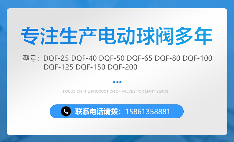 DQF电动球阀系列分别有:DQF-200电动球阀DN200,DQF-100电动球阀DN20,DQF-80电动球阀DN80,DQF-65电动球阀DN65,DQF-50电动球阀DN50,DQF-125电动球阀DN125,DQF-40电动球阀DN40,DQF-32电动球阀DN32,DQF100电动球阀DN100,DQF150电动球阀DN150,DQF200电动球阀DN200,DQF80电动球阀DN80